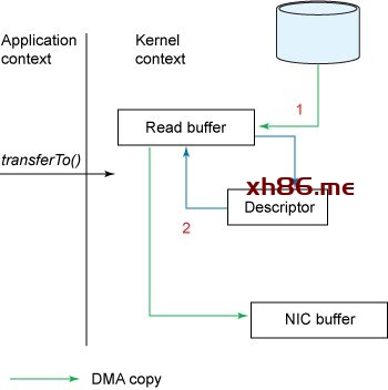 根据前面的示例,调用transferTo()方法会使设备通过 DMA 引擎将数据读取到内核读取缓冲区中。但是,使用gather操作时,读取缓冲区和套接字缓冲区之间没有复制。取而代之的是,给 NIC 一个指向读取缓冲区的指针以及偏移量和长度,该偏移量和长度由 DMA 清除。CPU 绝对不参与复制缓冲区。
