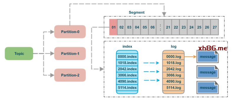 segment file 组成:由 2 大部分组成,分别为 index file 和 data file,此 2 个文件一一对应,成对出现,后缀”.index”和“.log”分别表示为 segment 索引文件、数据文件。  -