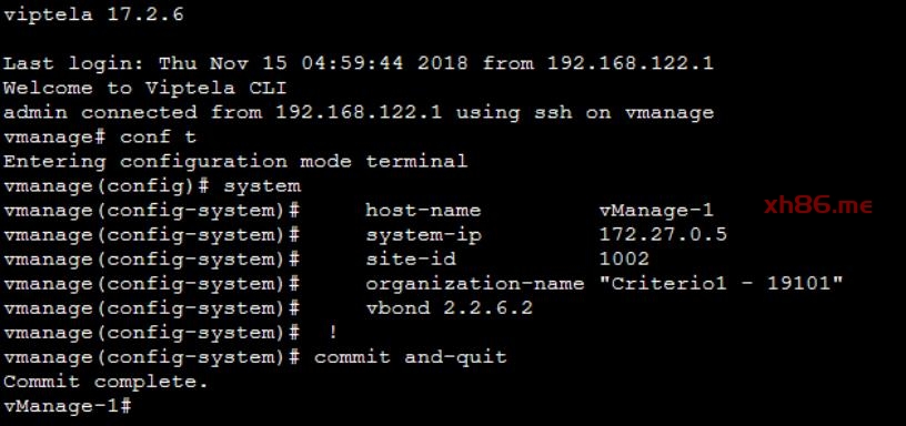 vManage 最小基本配置,包括 host name, system IP, site ID, organization name, and vBond IP. 命令行如下所示