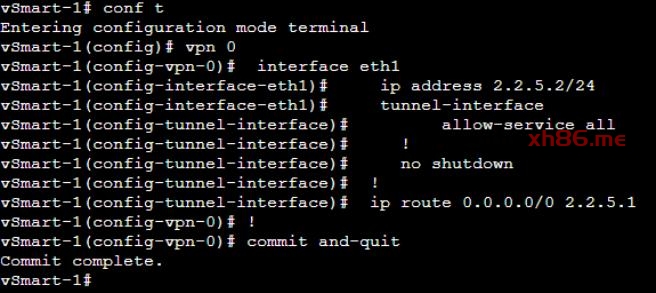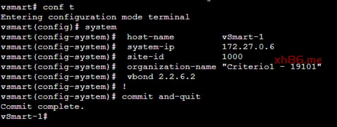 vSmart 最小基本配置,包括 host name, system IP, site ID, organization name, and vBond IP. 命令行如下所示
