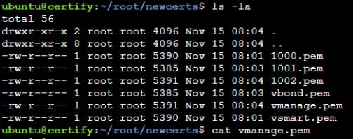 1.登陆CA,进入前面通过openssl生成签名证书的目录,进行查看vmanage.pem,vbond.pem,vsmart.pem.并复制其内容。