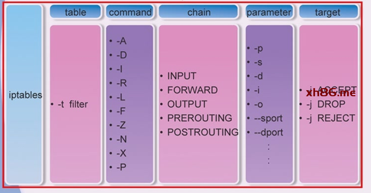 Iptables [-t 表名] 管理选项 [链名] [条件匹配] [-j 目标动作或跳转]