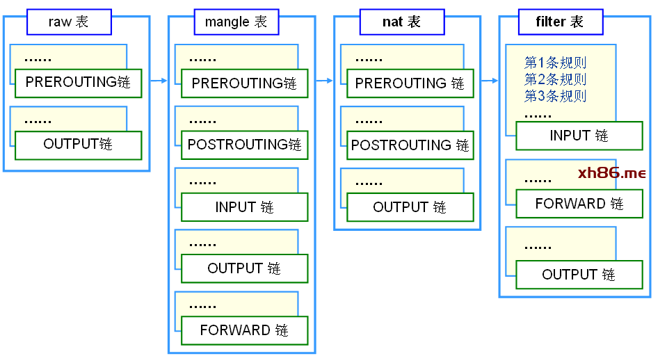 netfilter/iptables 后期简称为:iptables。 iptables是基于内核的防火墙,功能非常强大,iptables内置了filter,nat和mangle、raw四张表。所有规则配置后,立即生效,不需要重启服务。