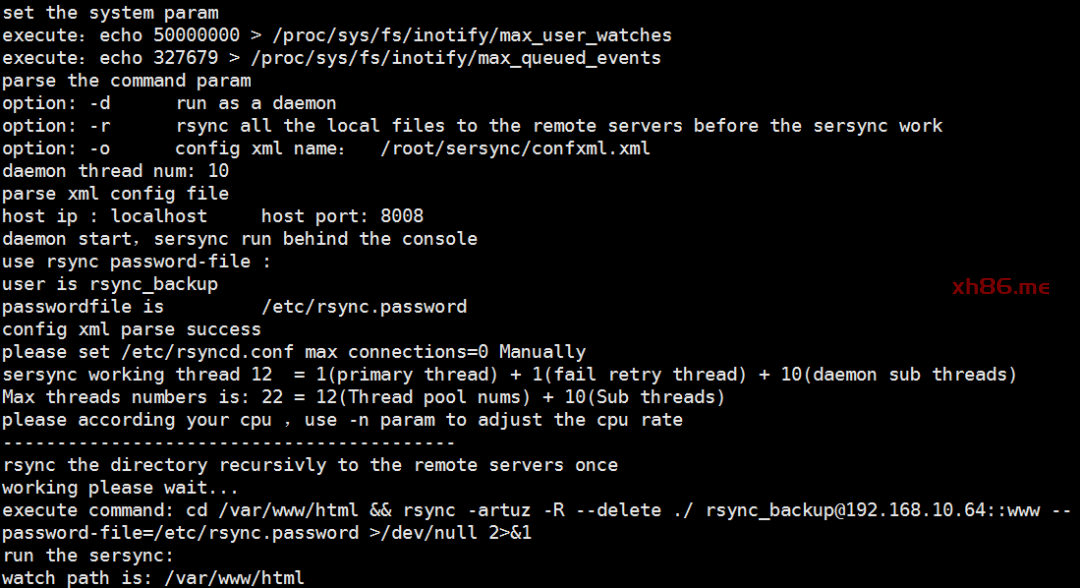 [root@xuegod63 sersync]# /opt/sersync/sersync2 -d -r -o /opt/sersync/confxml.xml