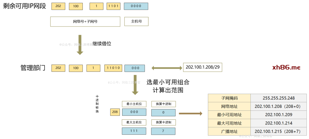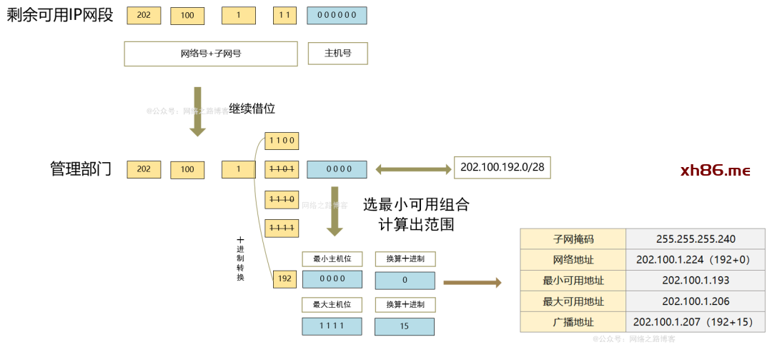 在用同样的方法,,第三个子网网段用了202.100.1.192/28,还三个可以继续使用,使用最小的,202.100.1.208/28,计算出财务部门。