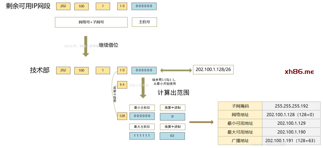 第一个已经使用了202.100.1.0/25,还剩下202.100.1.128/25没有划分,第二个子网就从这个里面继续开始划分。(主机数已经在第一个步骤与第二个步骤计算出来了,技术部主机号需要6位)