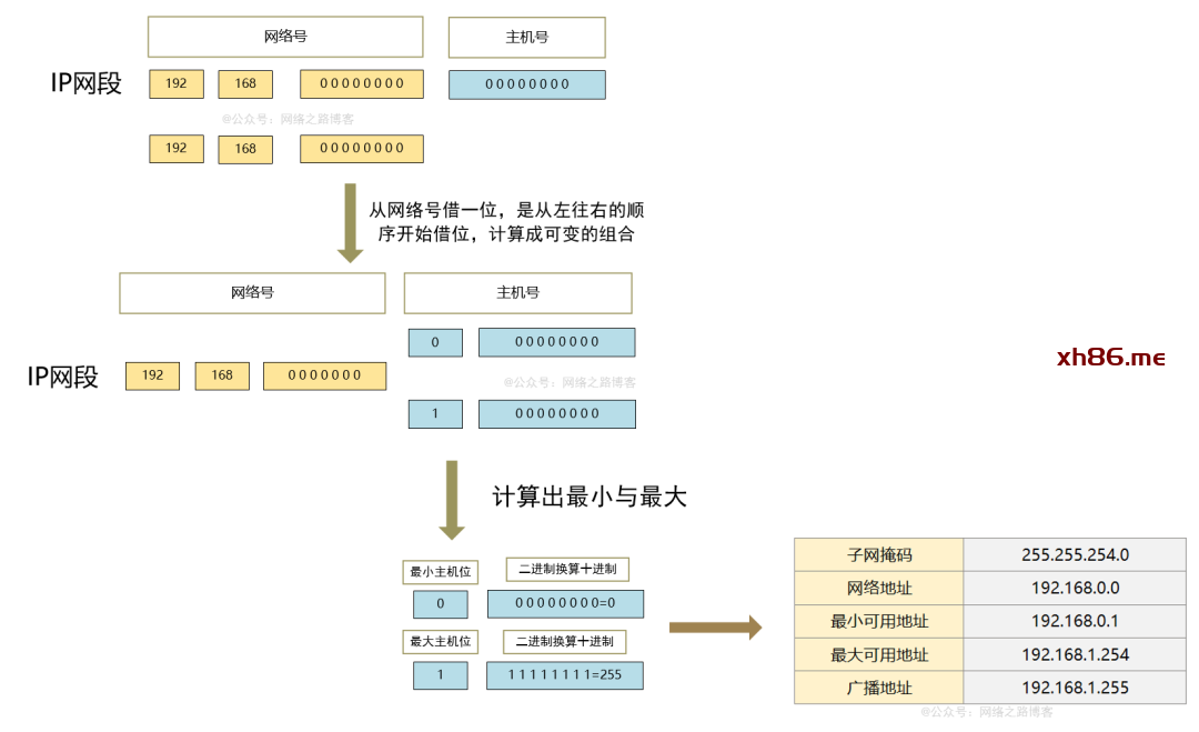 CIDR后,相当于最终的网段则是192.168.0.0/255.255.254.0(23),可用地址为192.168.0.1到192.168.1.254,那么这里看一个比较有趣的事情,像192.168.0.255、192.168.1.0,如果按C类标准24位掩码,它明显是一个网络地址以及广播地址,这也是很多面试或者题目里面经常会问到的,它就给你这么一个地址,问你是是不是广播地址或者网络地址,很多朋友就会忽略后面的子网掩码,就直接选择是,但是,实际上一定要看子网掩码是多少,如果它是24位的掩码,那确实是,但是如果是23或者22等掩码,就不是了,通过上面就可以计算出,最小的主机位是192.168.0 0 0 0 0 0 0 0. 0 0 0 0 0 0 0 0(192.168.0.0),最大的主机为是192.168.0 0 0 0 0 0 0 1,1 1 1 1 1 1 1 1(192.168.1.255),192.168.0.255以及192.168.1.0在子网掩码255.255.254.0中,既不是网络地址也不是广播地址,而是可用的地址。