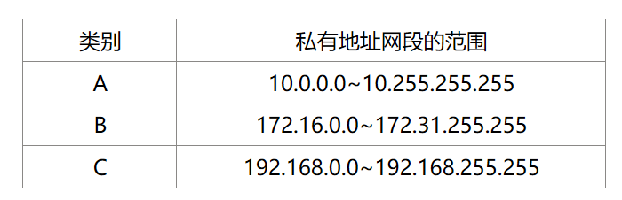 之前提到过IP地址在互联网中是有唯一标识的,这个指的是公网地址,私网地址的作用是什么呢?可以想象下,如今的一个办公楼、一个有点规模的企业,少则几十人,多则几百人,而且每个人手里不单单只有办公电脑,可能手机、平板都要接入到网络中来,那对于地址这块的消耗是非常大的,私网地址的作用就是在之前的A、B、C类里面拿出来一小部分作为私网地址的范围,这个范围的地址任何公司的局域网都可以使用,只要同一个局域网内网段没有重复、冲突即可,私网地址的出现,又帮助了IP地址缓解了枯竭的速度。
