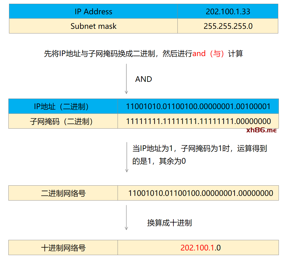 举例:202.100.1.33的子网掩码为255.255.255.0,算出它的网络号。
