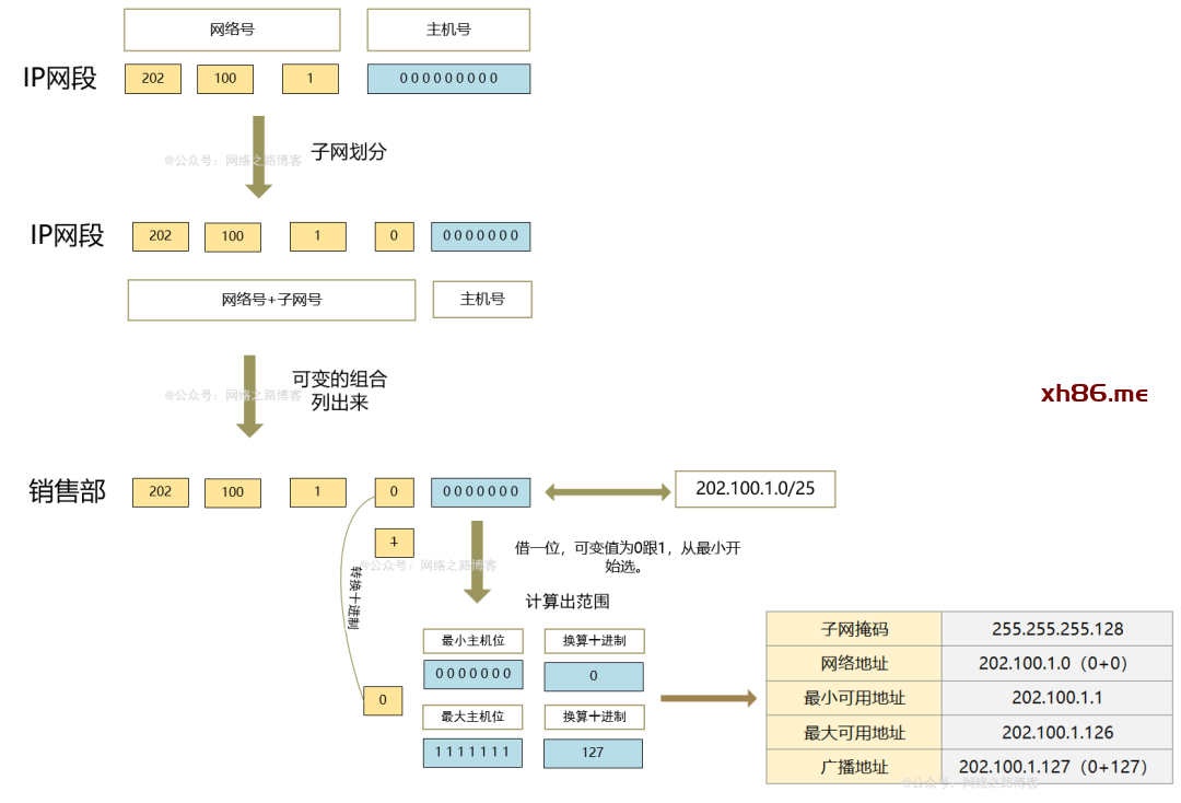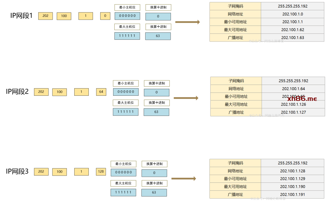 这样就得前24位为网络号,网络号为202.100.1,主机号为最后一位,可用地址为1~254(其中0是网段地址,255是广播地址排除)