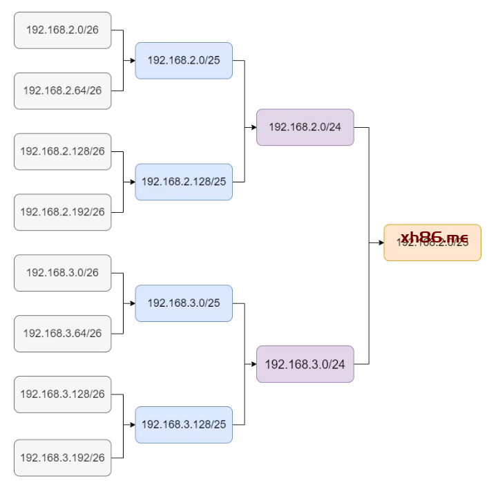 从上面两个举例可以看出来,VLSM是将一个大的网段划分成多个小的子网,让地址需求少的用户获取相近数量的地址,避免浪费,它的核心理念就是从主机号进行借位,变成子网号。那CIDR正好相反,来看一个例子。