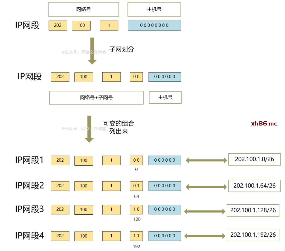 (3)开始进行划分,把网段202.100.1.0/24的主机号,借两位变成子网号,可以划分出4个等同大小的子网,怎么快速得到的是4个呢?22=4,当然也可以按下面的办法把能组合的列出来,就自然知道了。