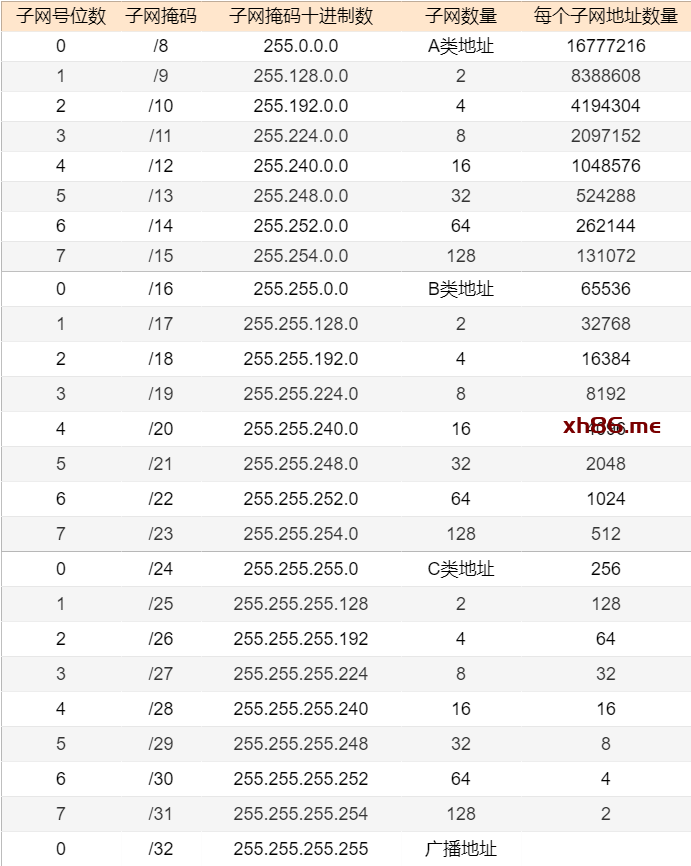 - 子网掩码,表格从/8开始到/32都列出来了,不需要都记住,项目中经常遇到的/22~/26以及/30与/32,记住这几个常用的即可,其余的遇到了,查下或者换算下就可以得到了。