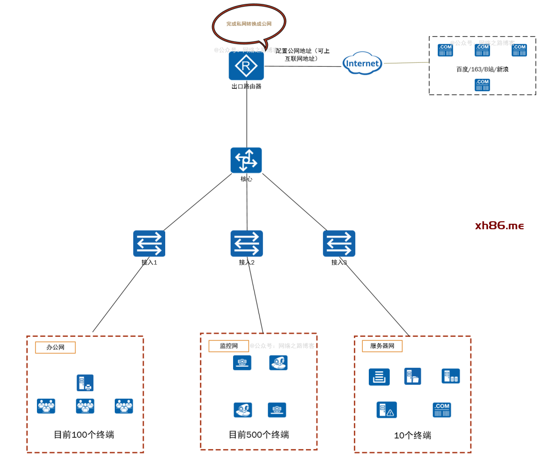 上面拓扑是一个常见的企业网的架构,中间的设备现在还没学习路由交换的技术,可能看不懂,这个没关系,简单理解就是,这个企业网有三个内网,一个办公网,一个监控网,一个服务器网,办公网需要100个终端,监控网500个终端,服务器网10个终端,客户希望每个网独立一个网段,那我们在实际中去规划这个网段的时候应该怎么去规划呢?