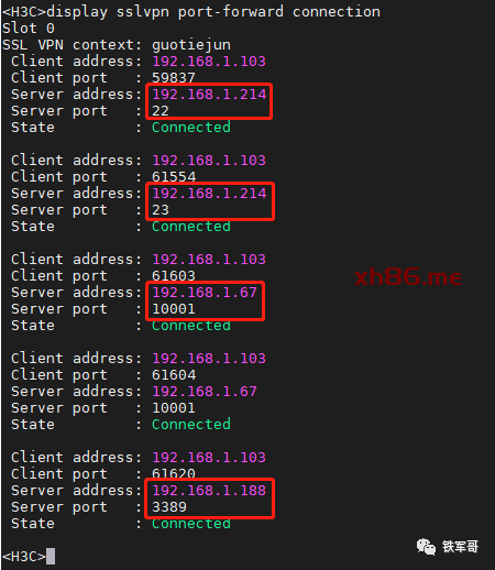 #sslvpn context guotiejunport-forward-item http67local-port 20002 local-name 127.0.0.1 remote-server 192.168.1.67 remote-port 10001port-forward-item rdp188local-port 20003 local-name 127.0.0.1 remote-server 192.168.1.188 remote-port 3389port-forward-item telnet214local-port 20004 local-name 127.0.0.1 remote-server 192.168.1.214 remote-port 23