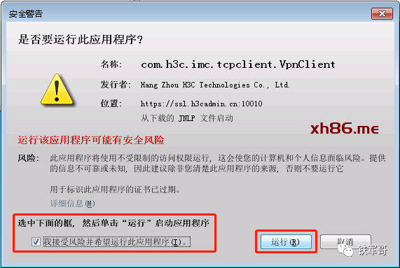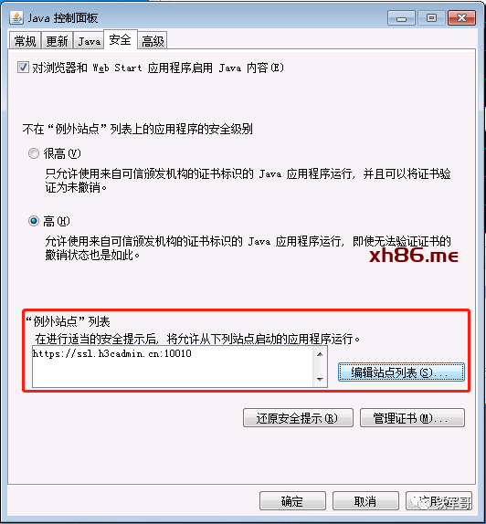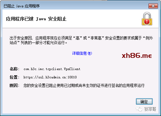 然后就是Java的安全提示,要求应用程序必须满足“高”或“非常高”的安全设置或属于“例外站点”。这个简单,只要在“Java控制面板”的“安全”选项卡中,添加SSL VPN网关为例外就可以了。