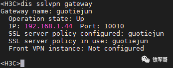 #sslvpn gateway guotiejunip address 192.168.1.44 port 10010ssl server-policy guotiejunservice enable