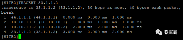 从SITE2追踪到SITE1的路径信息,可以看到,流量先到达网关SPOKE2,再到达HUB,再到达SPOKE1,最后到达SITE2,符合Hub-Spoke模型的转发路径,即:Spoke之间不能建立隧道直接通信,只能通过Hub转发数据。