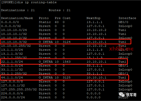 查看SPOKE1设备路由,已经通过OSPF学习到了HUB和SPOKE2的私网路由。