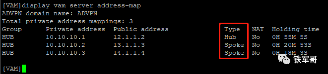 显示注册到主VAM Server的所有VAM Client的IPv4私网地址映射信息,可以看到HUB和SPOKE设备对应的隧道接口地址、公网地址、角色等信息。