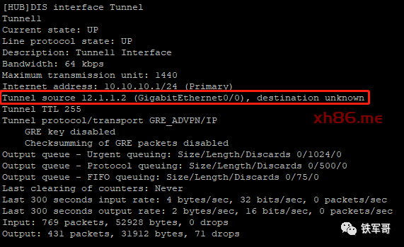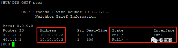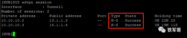 显示HUB上的IPv4 ADVPN隧道信息,可以看到类型是H-S,说明本端是HUB角色,对端是SPOKE角色。
