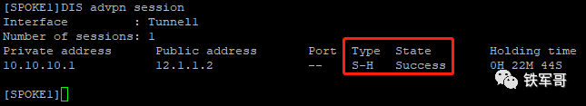 显示SPOKE1上的IPv4 ADVPN隧道信息,可以看到类型是S-H,说明本端是SPOKE角色,对端是HUB角色。