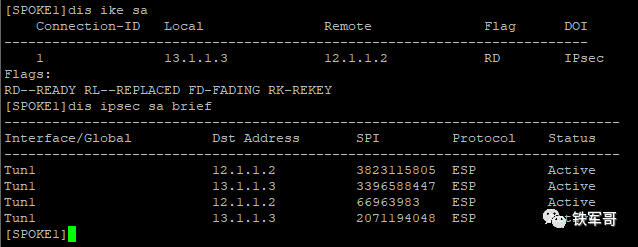 查看SPOKE1建立的IKE SA和IPsec SA信息,可以看到,隧道只存在于HUB和SPOKE1之间。