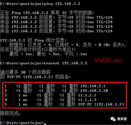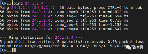 可以看到,访问正常,并且通过tracert查看转发路径,流量是先到网关,再到CPE1,再到POP,再到CPE2,最后到达目标主机PCB。