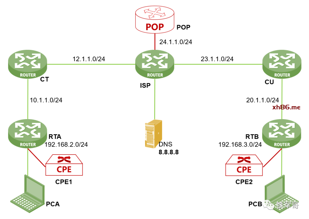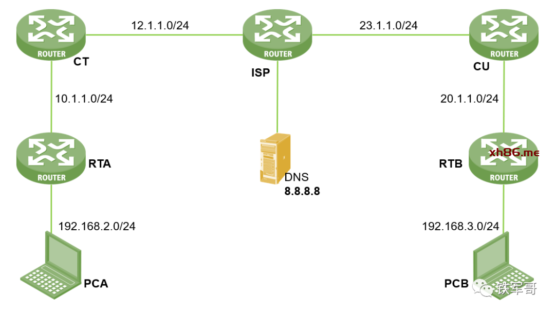 假设有这样一张网络,其中RTA和PCA表示某公司的A分支,通过中国电信CT路由器接入互联网ISP;RTB和PCB表示某公司的B分支,通过中国联通CU路由器接入互联网ISP。DNS(8.8.8.8)表示某互联网应用。