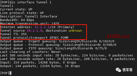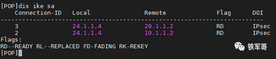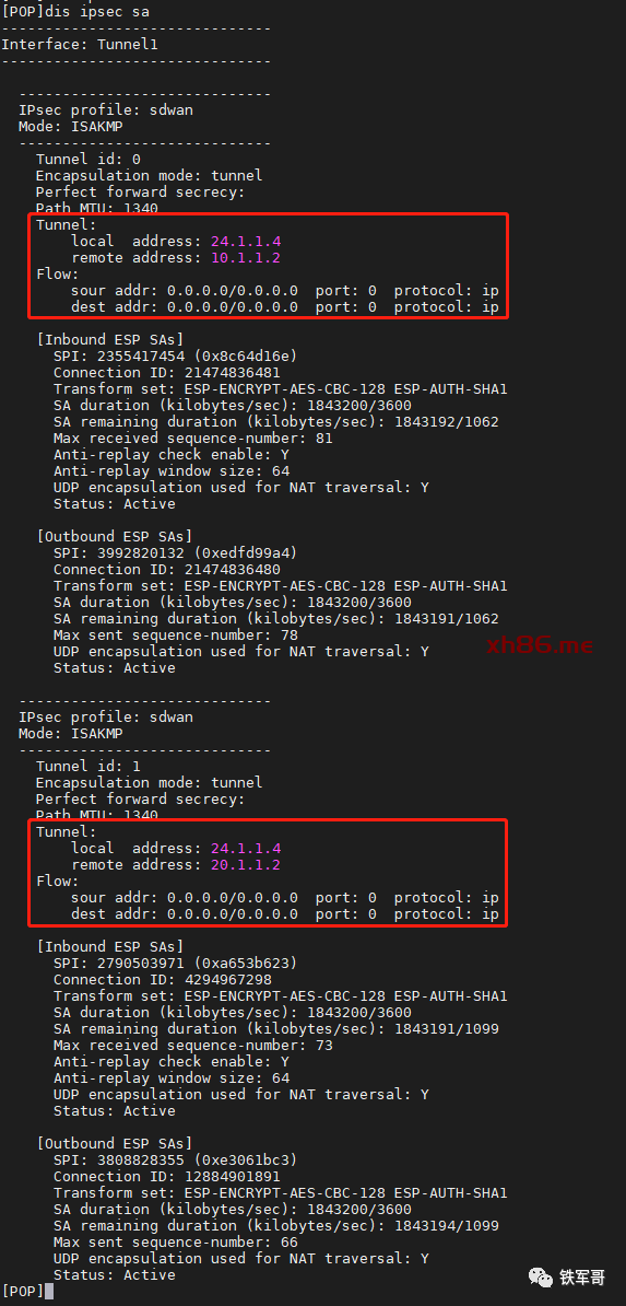 可以看到POP上隧道对端的地址是分支的出口公网IP地址,而流量是全0的,也就是说,任何流量转发过来都会封装IPsec,这就是IPsec隧道的魅力所在。