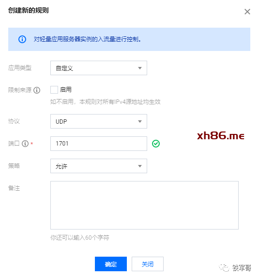 创建完成之后,记得在云主机的防火墙配置中添加一个放通UDP端口1701的规则,这个是L2TP VPN的通信端口。
