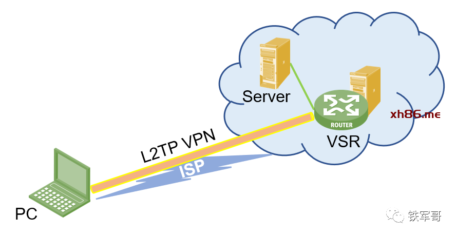 本次L2TP VPN配置,我们使用客户端直接向服务器发起请求、建立隧道的模式,只需要配置VSR这一台设备作为LNS(L2TP Network Server,L2TP网络服务器)即可。