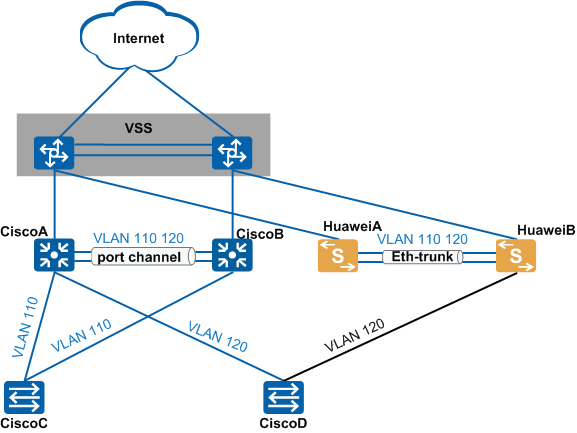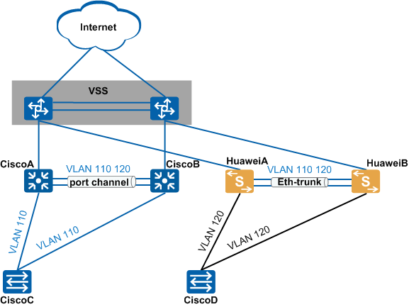 测试HuaweiB下挂业务。验证无问题后,将原互连CiscoA和CiscoD的物理线缆割接至HuaweiA,打开HuaweiA端口。完成CiscoD的割接。如下图所示: