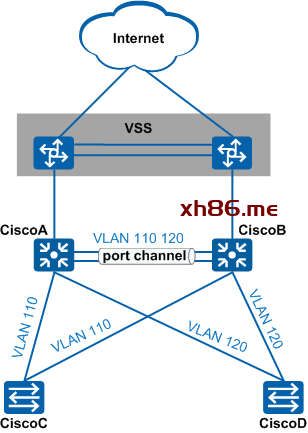 如图1所示,组网中均为思科交换机。两台核心交换机采用堆叠方式。两台汇聚交换机之间使用手工模式的Eth-trunk进行链路冗余备份,上行通过配置OSPF与核心交换机建立OSPF邻居关系收发路由,下行通过配置HSRP实现虚拟网关备份,其中CiscoA为主用网关设备,CiscoB为备用网关设备。组网中交换机通过Rapid PVST+进行破环操作。