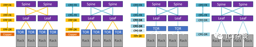 下一步,来自叶交换机的上行链路可以迁移到 CPO,再次使用 400GBASE-DR4 或 -FR4 PMD。这些交换机还可以从混合实施中受益,其中只有部分端口(上行链路)装有 CPO 引擎,而下行链路则坚持使用可插拔光学器件。CPO 与可插拔端口的比率将取决于叶交换机需求。