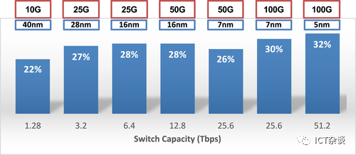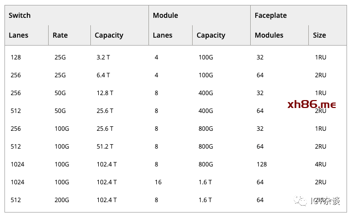 图1还显示了 Serdes 波特率和调制类型。12.8 Tb/s第一个采用PAM4信令而不是传统的NRZ信令的,用较低的信噪比换取较高的比特波特率。
