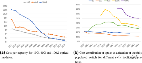 然而,交换机 ASIC 单位容量成本下降的速度比光学器件的成本下降得更快。这导致光学器件在交换机的总成本中所占的相对成本增加。如图2b所示,这个比率在从 10G 到 400G 的增加很快。对于 400G 一代,预计光学器件将占总成本的 50% 以上。
