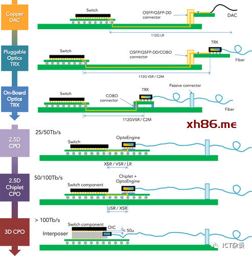 CPO 发展路线说明了光学器件和交换机 ASIC 的集成水平不断提高。此图表示侧重于光学器件和 ASIC 之间的线性距离,但请注意,CPO 解决方案的关键指标之一是交换机的带宽密度。