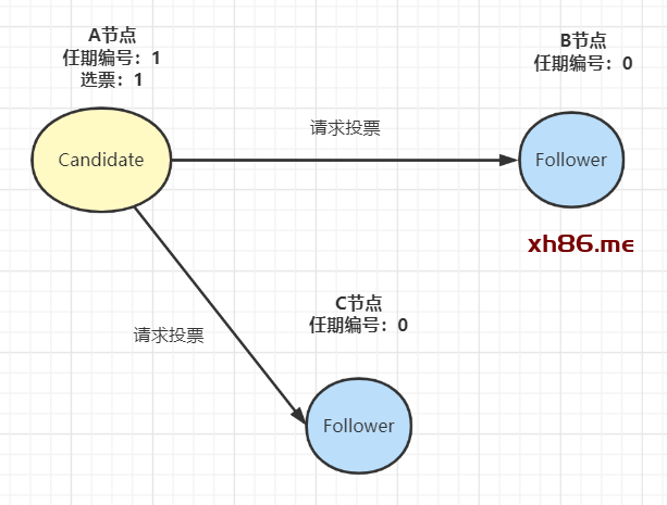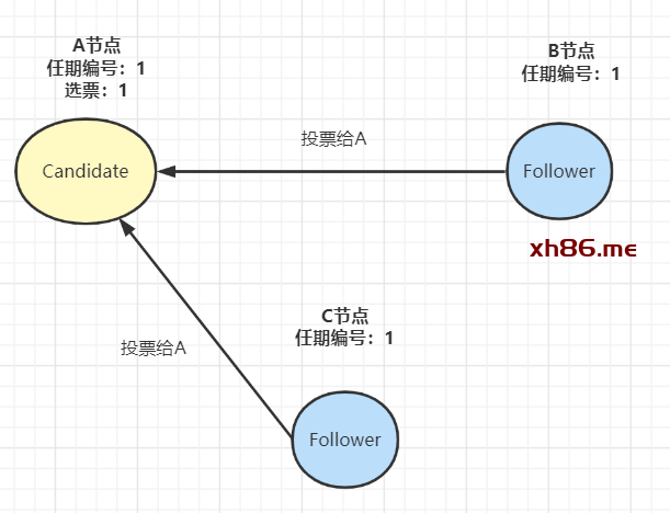 其他节点收到候选人A的请求投票消息后,如果在编号为1的这届任期内还没有进行过投票,那么它将把选票投给节点A,并增加自己的任期编号: