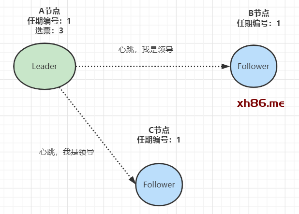 当收到来自集群中过半节点的接受投票后,A节点即成为本届任期内 Leader,他将周期性地发送心跳消息,通知其他节点我是Leader,阻止Follower发起新的选举: