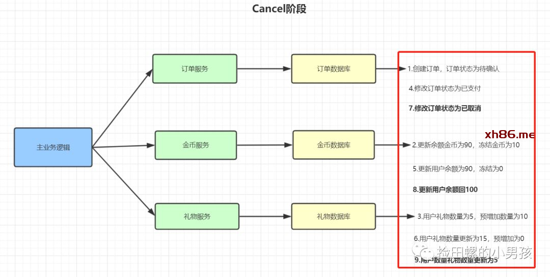 Cancel 阶段:若业务执行失败,则进入该阶段,它会释放try阶段占用的所有业务资源,并回滚Confirm阶段执行的所有操作。