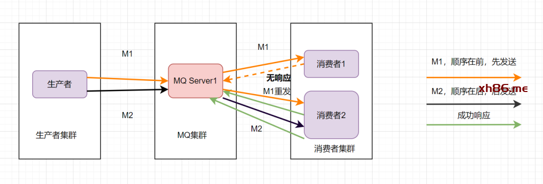 这样还是可能会有问题,因为从MQ服务器到服务端,可能存在网络延迟,虽然M1先发送,但是它比M2晚到。