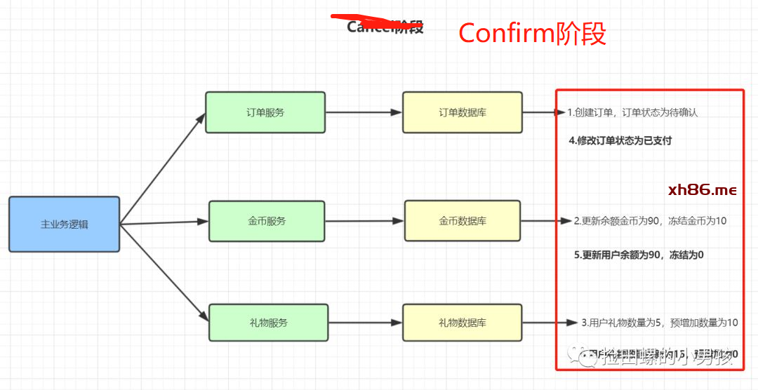 Confirm阶段:该阶段对业务进行确认提交,不做任何检查,因为try阶段已经检查过了,默认Confirm阶段是不会出错的。 -