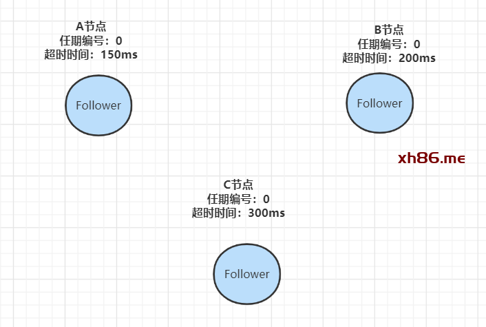 在初始时,集群中所有的节点都是Follower状态,都被设定一个随机选举超时时间(一般150ms-300ms):