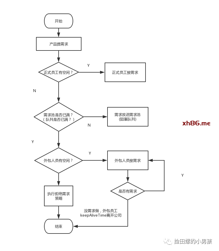如果需求池(阻塞队列)也满了,但是这时候产品继续提需求,怎么办呢?那就请外包(非核心线程)来做。 -