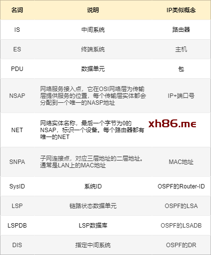 ES-IS :终端系统与中间系统的通信协议。不属于路由协议。ES 和 IS 间建立邻接关系,数据链路地址到网络地址的映射。类似于 TCP/IP 协议中的 MAC 地址到 IP 地址的映射。