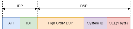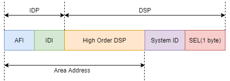 NSAP 地址由 IDP(初始域部分)和 DSP(域指定部分)组成,IDP 和 DSP 又进一步划分。IDP 和 DSP 长度可变,那么 NSAP 地址的总长度也不固定,最短是 8byte ,最长是 20byte 。