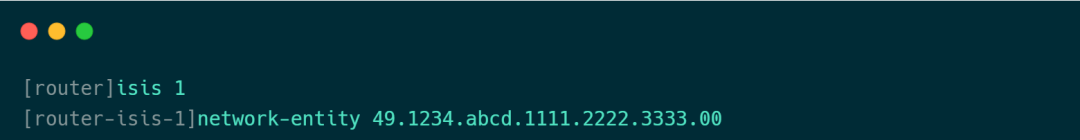 isis 命令创建进程,并进入配置视图,isis 命令可指定进程 Process-ID 。如果未指定 Process-ID ,系统就会自动分配一个默认的。配置视图下,network-entity 命令配置 NET ,NET 是 49.1234.abcd.1111.2222.3333.00 ,系统 ID 是 1111.2222.3333 ,也可以是接口的 MAC 地址;区域 ID 是 49.1234.abcd 。配置 NET 时,只需要关注区域 ID 和系统 ID 这两个信息。