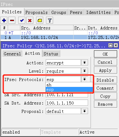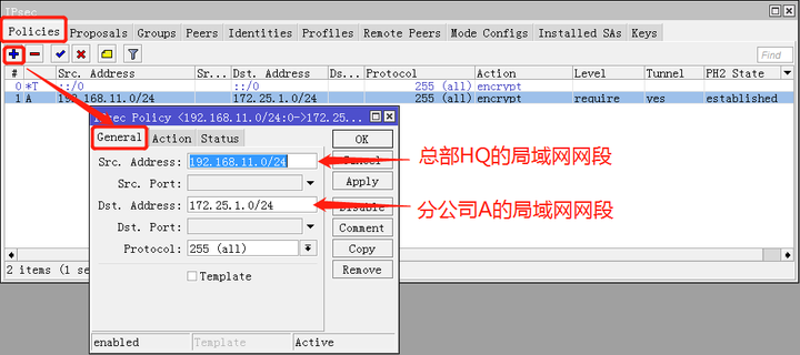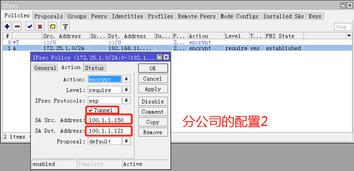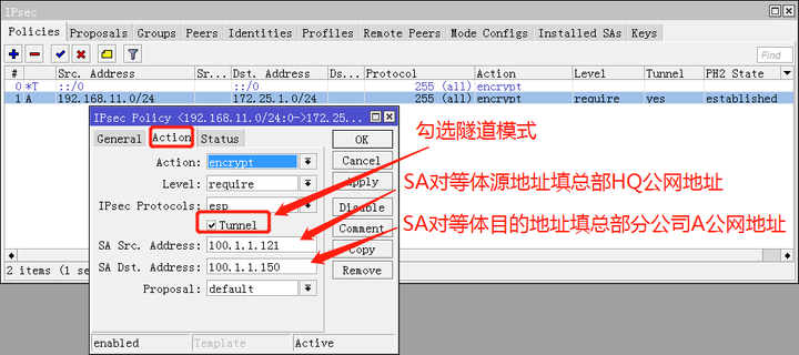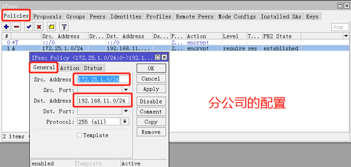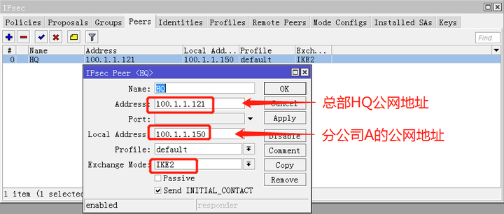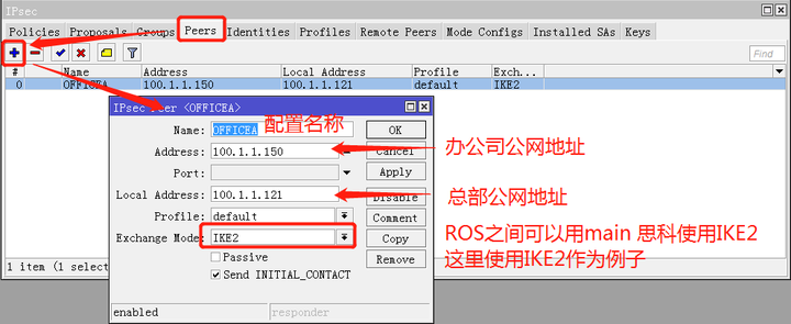 注意:本例的IPSEC互联需要两端都是公网IP,如果使用IPSEC野蛮模式,则是另一种方式。