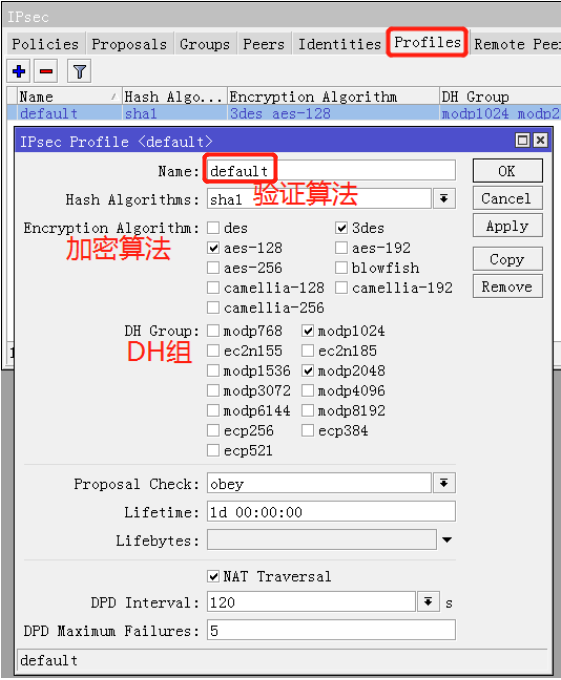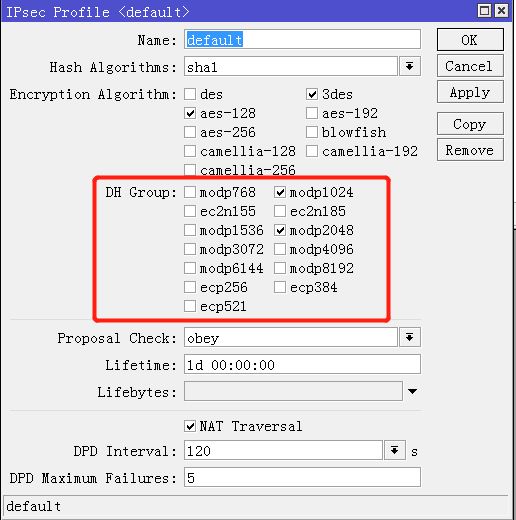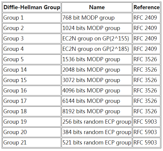 附录:现阶段的的路由器使用Diffie-Hellman Group,和Router OS的DH加密的映射关系如下。(同样适用于PFS Group –PFS组,皆因为其他厂家的路由器一般都是Group表示)
